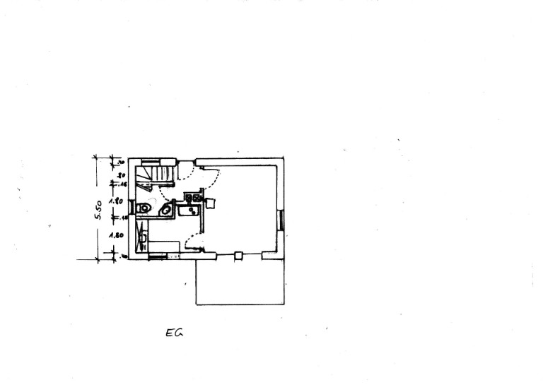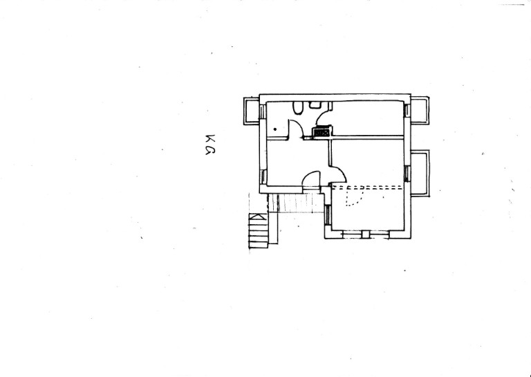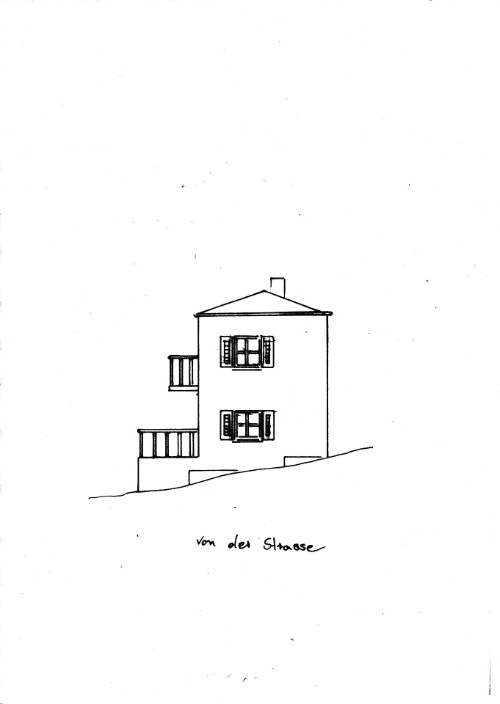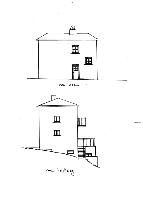 In der oberen Zeichnung der Haupteingang, der bedingt durch die Hanglage zwar das Erdgeschoss erreicht,